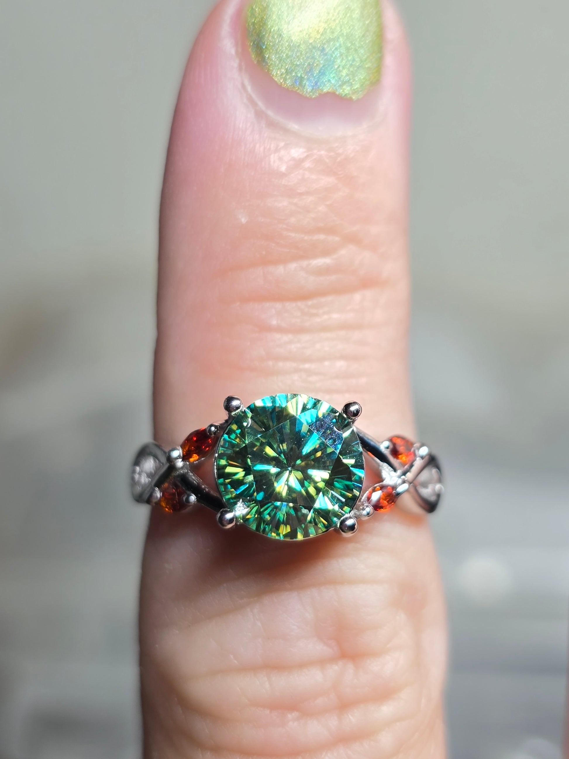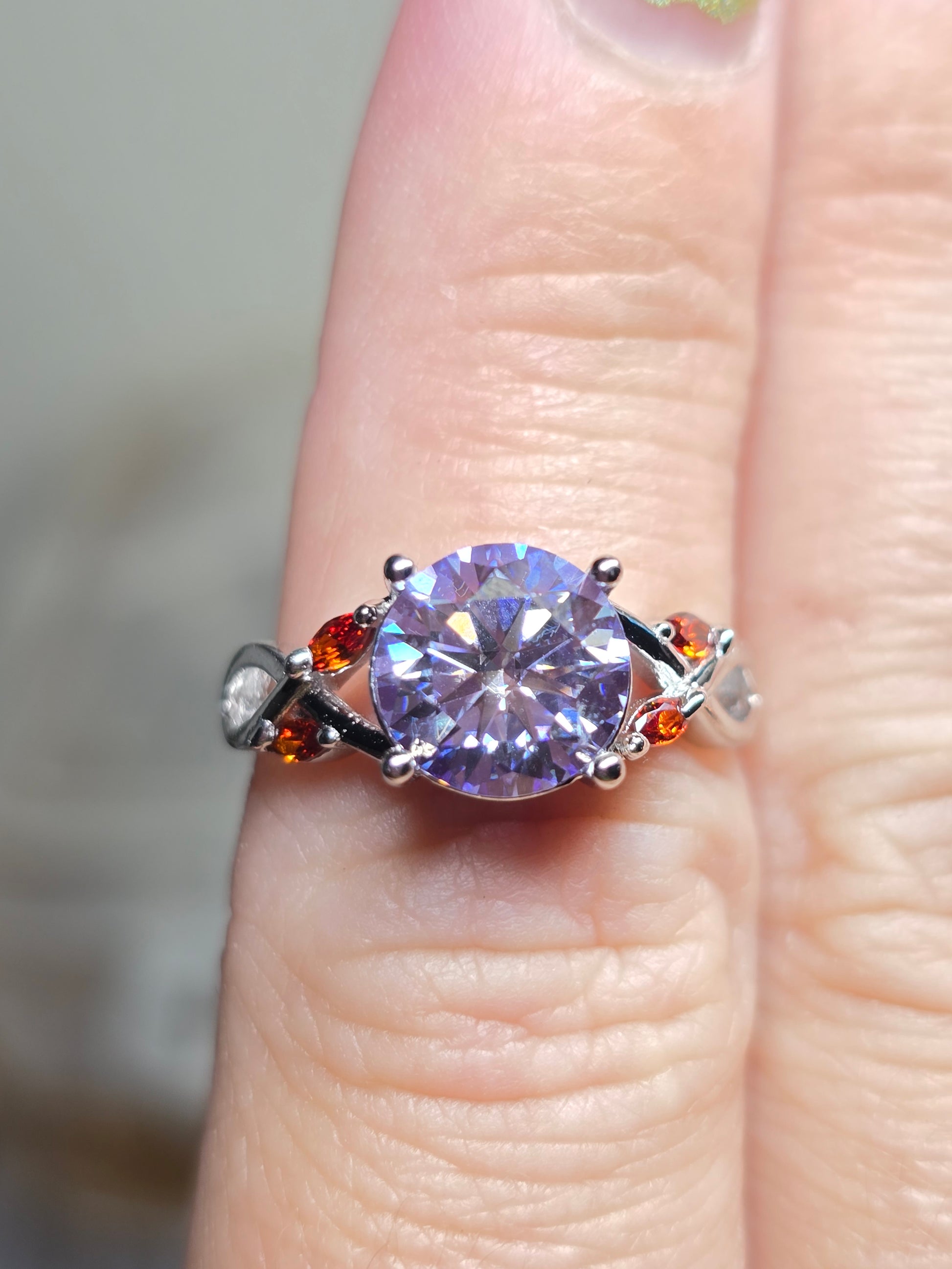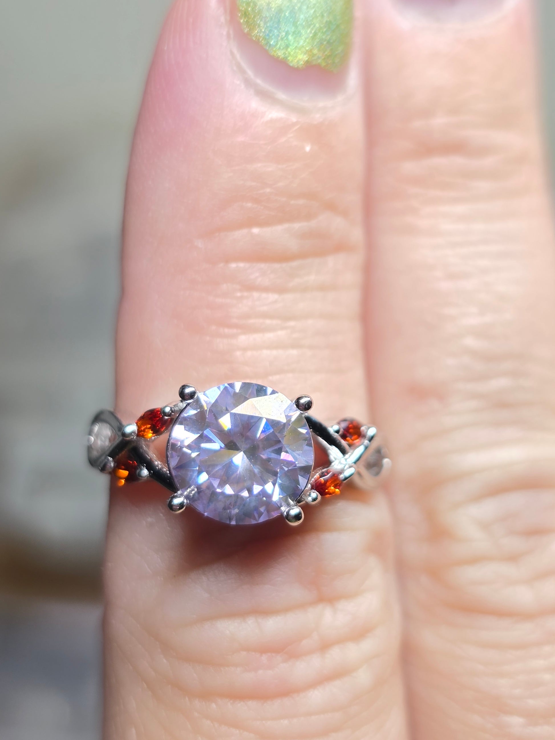 8mm 2ct genuine moissanite with red cubic zirconia accents.